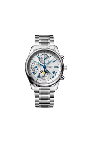 CHRONOGRAPH FUNCTIONS: Chronograph mechanism: central 60 seconds hand, moon phase display with 12 hours counter at 6 o'clock and 30 minutes counter with day and month display at 12 o'clock